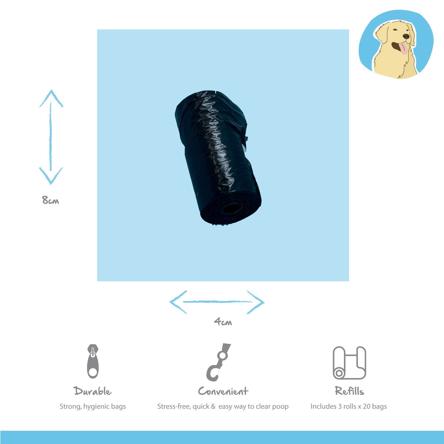 Whether you're out for a walk, at the park, or travelling with your dog, these reliable poo bags provide peace of mind, ensuring you're always prepared for a quick clean up. Durable, leak resistant and easy to use. The perfect solution for on the go pet owners!