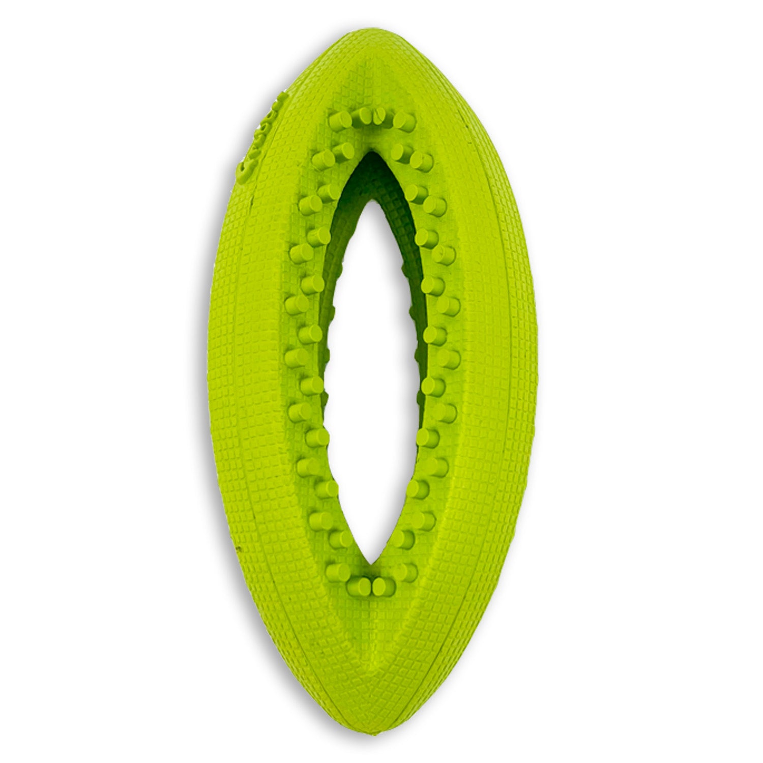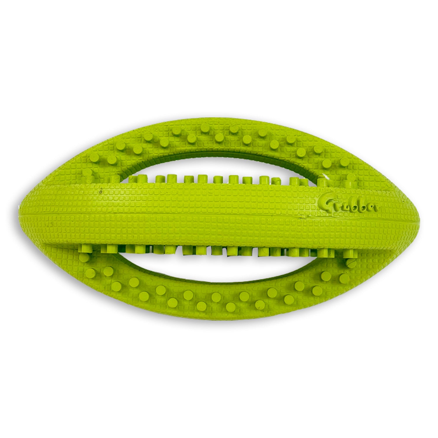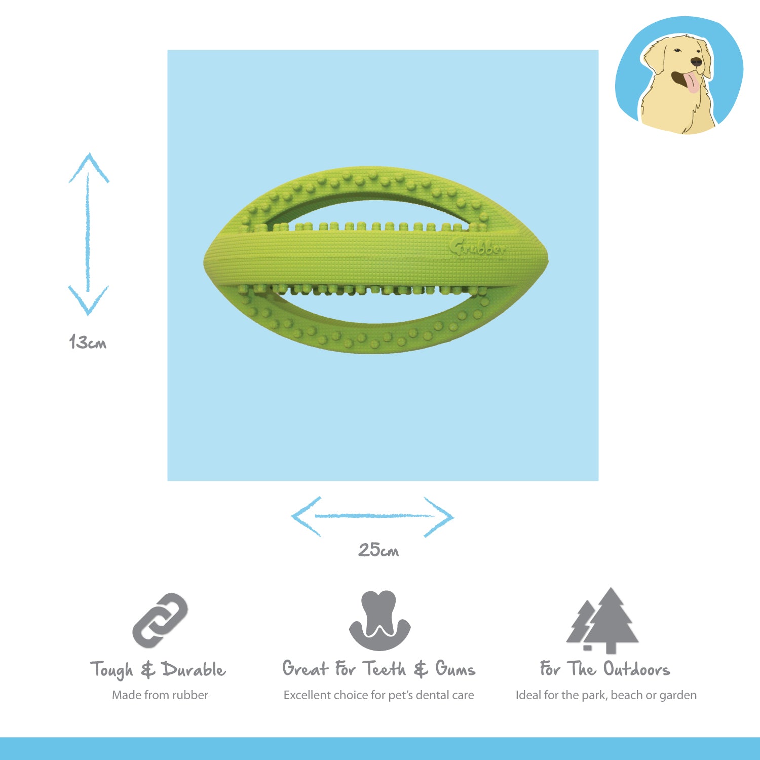 This Grubber Tough Rubber Rugby Ball dog toy is the ultimate playtime companion for your pet, designed to keep them entertained and healthy. Made from durable rubber, this toy provides hours of fun while also promoting oral health. As your dog chews on the toy, it helps clean their teeth and massages their gums, contributing to a healthier smile and better dental hygiene.