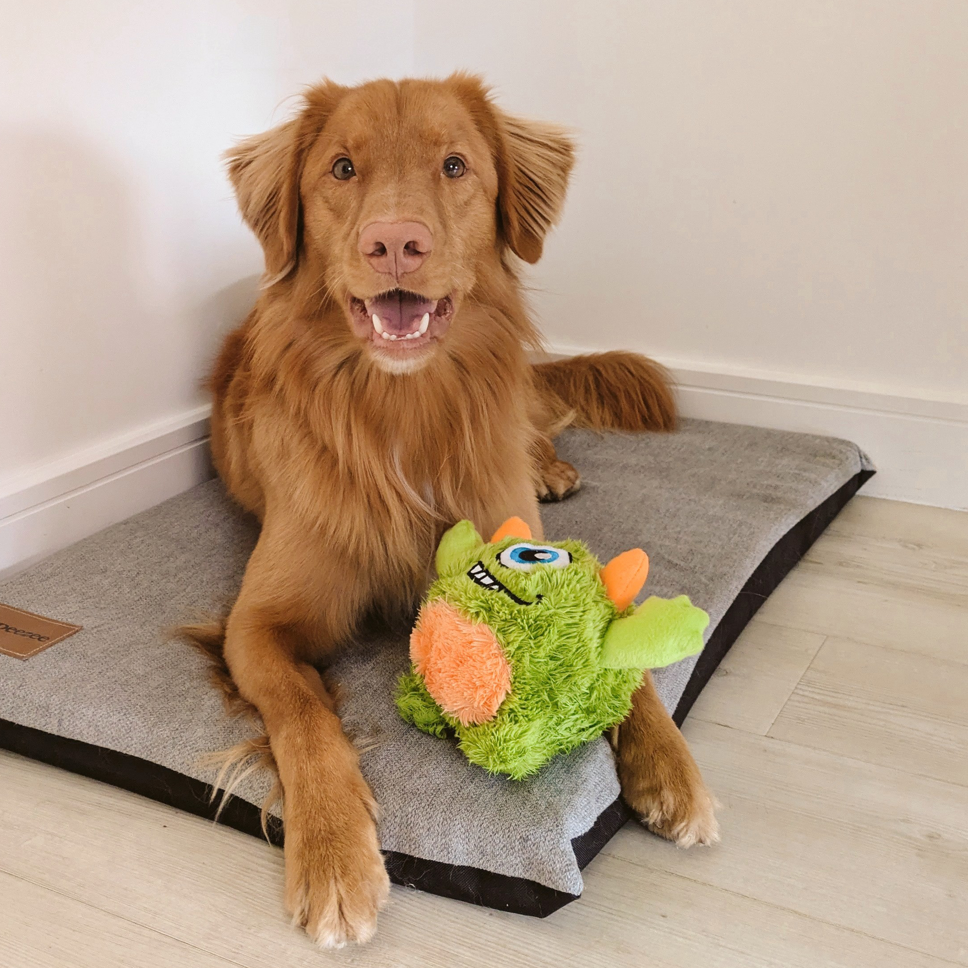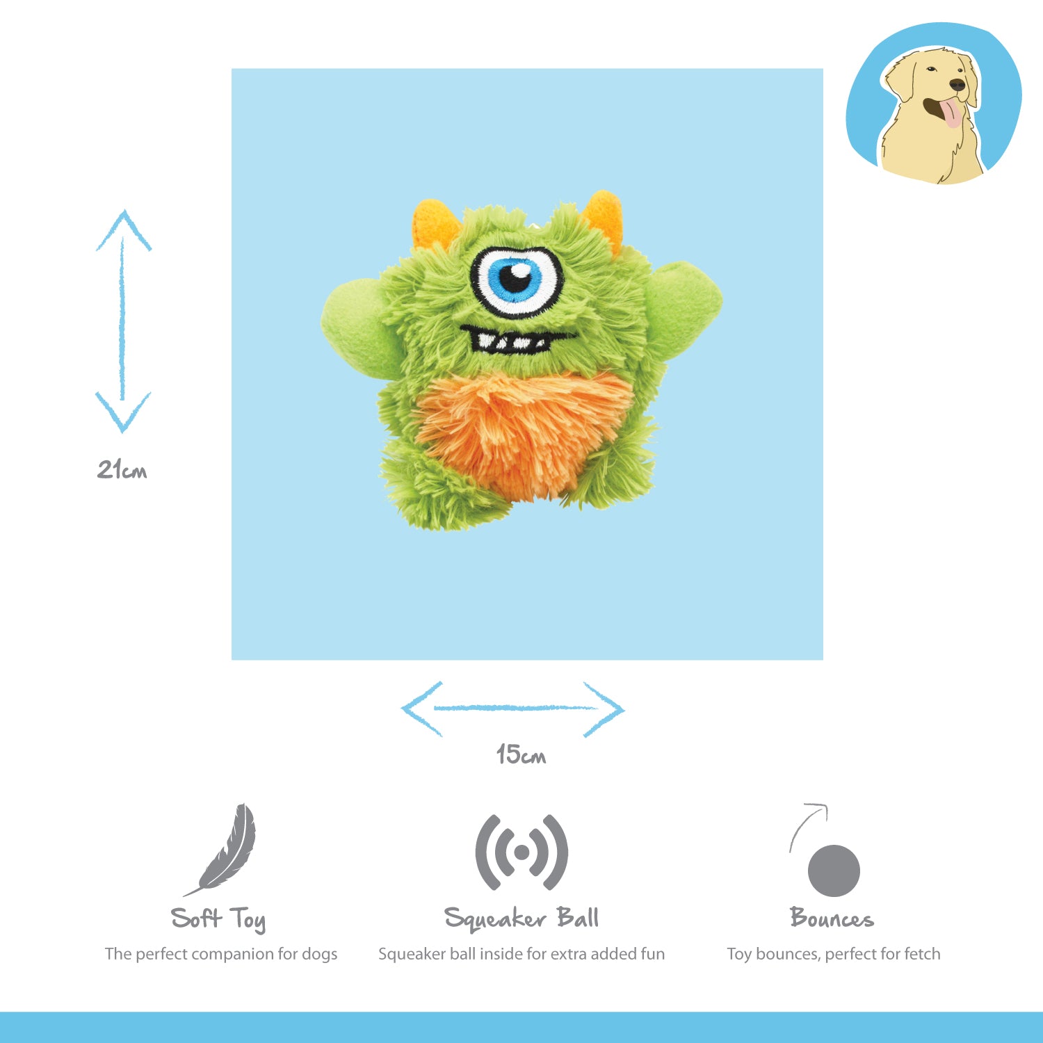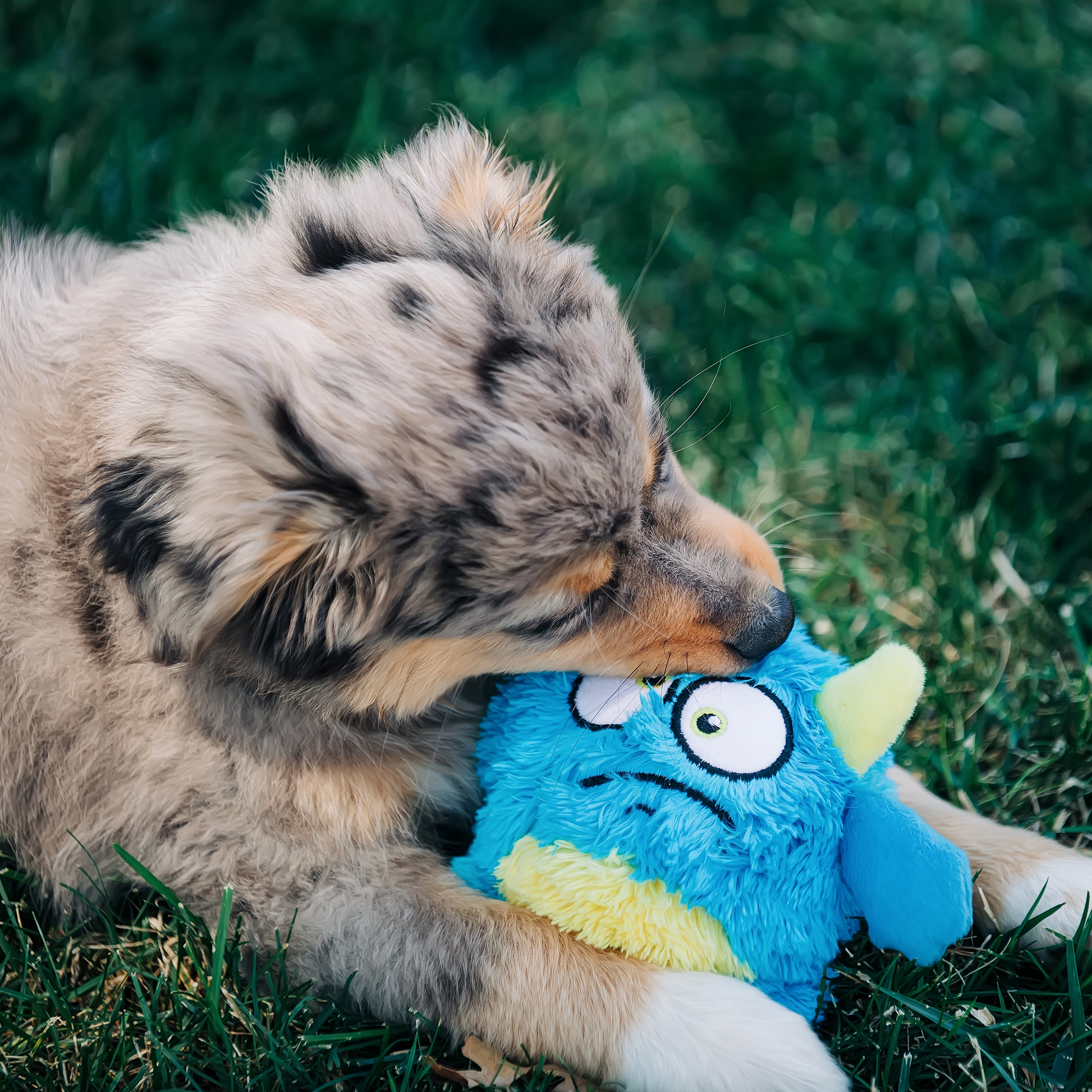 The Oggles toy includes a built in squeaker that activates with a simple squeeze, sparking your dog's curiosity and excitement. Designed with a fun and quirky monster theme, this toy is sure to capture your pup's attention and keep them engaged for hours. Whether it's playtime, naptime, or both, the Oggles dog toy is a perfect addition to your dog's toy collection. Available in three brightly coloured characters, you can choose the one that best matches your dog's personality. With its combination and playfulness, the Oggles toy will quickly become your dog's favourite new friend.